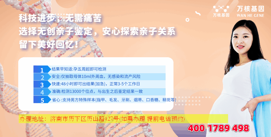 济南亲子鉴定基因检测是一家专为历下区、市中区、槐荫区、天桥区、历城区、长清区、章丘区、济阳区、平阴县、商河县等济南及周边地区服务的亲子鉴定咨询机构,办理地址:济南市历下区历山路127号(如需办理,需提前预约)预约电话:4001789498。